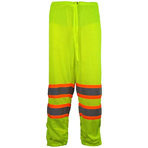 Details: Global Glove Mesh safety pants. High Visibility fluorescent yellow. Lightweight mesh polyester, contrasting silver reflective material on orange backing. Inside pocket and outside pocket. 2 horizontal class E glass bead over orange contrasting silver. Qualities: class E, mesh for breath ability, highly reflective and extremely visible. Applications: great highway workers or any industry that has high visibility requirements for employees. Fits for 2X-large and 3X-large sizes. Lime green color.