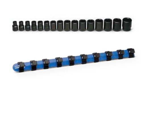 - Includes: (16) 1/2" Drive 6 Point Standard Impact Socket: 10mm, 11mm, 12mm, 13mm, 14mm, 15mm, 16mm, 17mm, 18mm, 19mm, 20mm, 21mm, 22mm, 23mm, 24mm, 27mm; (1) Rail; (16) Clips