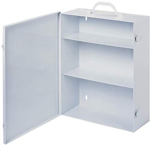 Details: 9FX (3 Shelf) Industrial First Aid Cabinet. Constructed using prime cold rolled steel. Door is welded in place using a full piano hinge with a rust resistant hinge pin. 3 Fixed shelves, including cabinet base. Positive catches keep it securely closed. Door swings open to the side. Convenient sturdy carrying handle. Keyhole slots in back provide for wall hanging. Sold without contents. Durable white powder coat finish. Shelves heights: 3-15/16"; 5-3/4"; 6-7/32". Measures 15" width by 16-5/32" height by 5-9/16" depth.