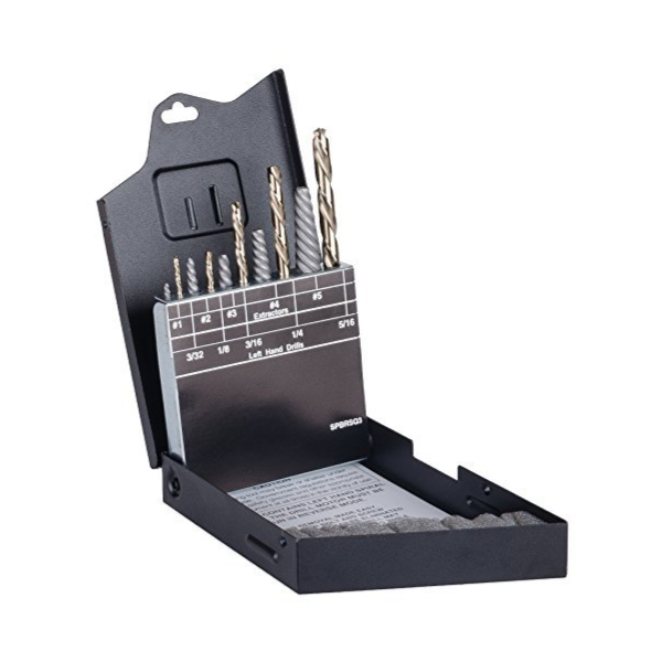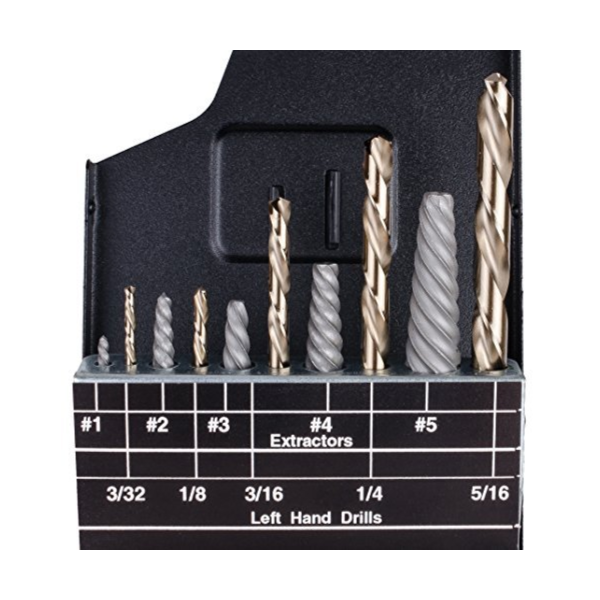 Set includes bolt extractor numbers: EX-1, EX-2, EX-3, EX-4 and EX-5 and left-hand drill bits 3/32", 1/8", 3/16", 1/4", and 5/16".